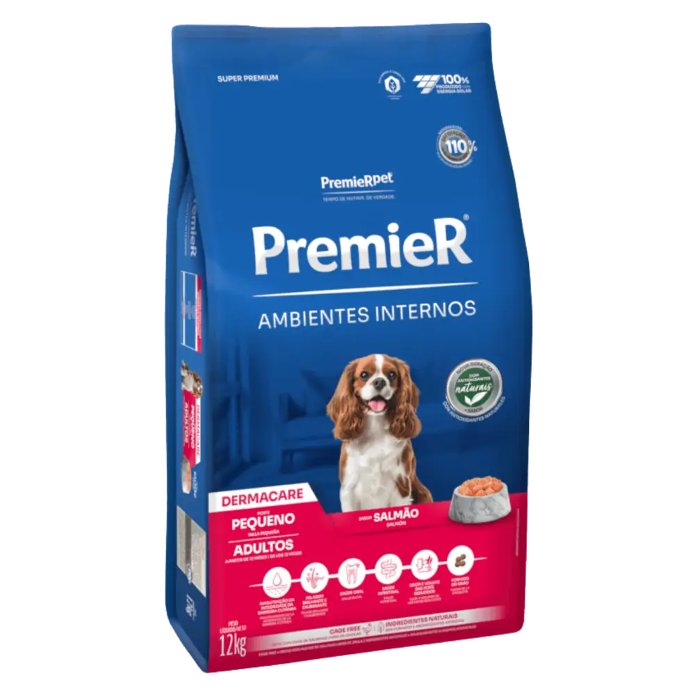 Ração Premier Ambientes Internos para Cães Adultos de Raças Pequenas Dermacare Sabor Salmão quantidade