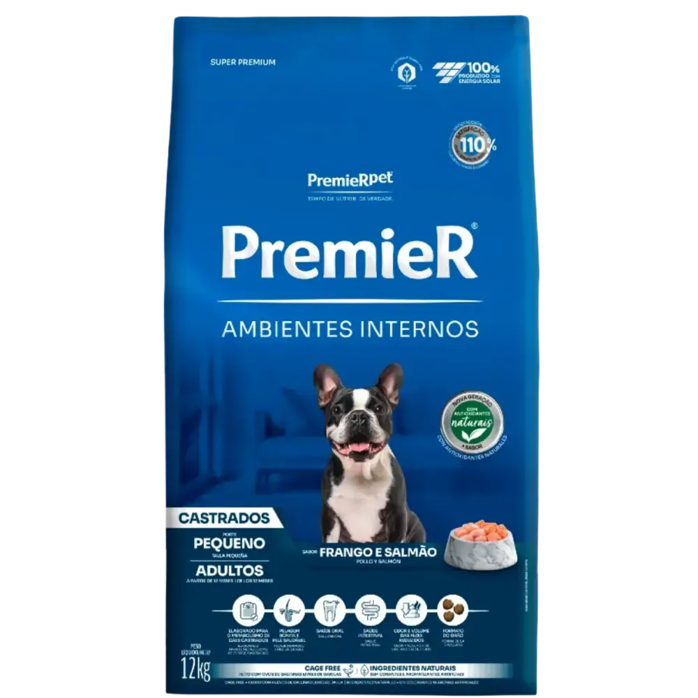 Ração Premier Ambientes Internos para Cães Adultos Castrados Sabor Frango e Salmão quantidade